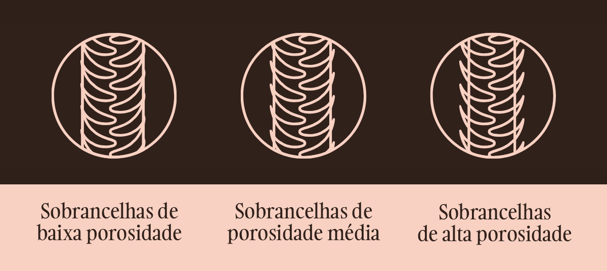 • Sobrancelhas de alta porosidade – pelos secos e opacos com cutículas levantadas. Absorvem produtos rapidamente, mas também perdem pigmento mais rápido e são mais propensos à desidratação. Requerem tempos de processamento mais curtos e cuidados adicionais nutritivos.